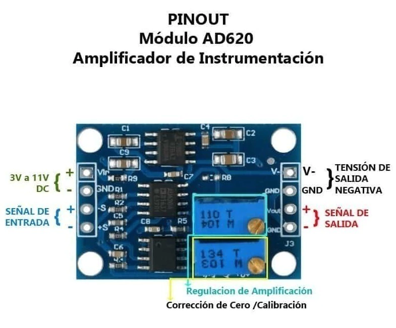 Cuenta con ajuste de punto nulo, salida de voltaje negativo y filtrado de ruido, lo que garantiza una señal estable, de baja distorsión y alta fidelidad. Su diseño facilita la conexión directa con microcontroladores y placas de desarrollo como Arduino. También está disponible el circuito AD620 en encapsulado DIP-8 para uso en protoboard o PCB personalizadas.