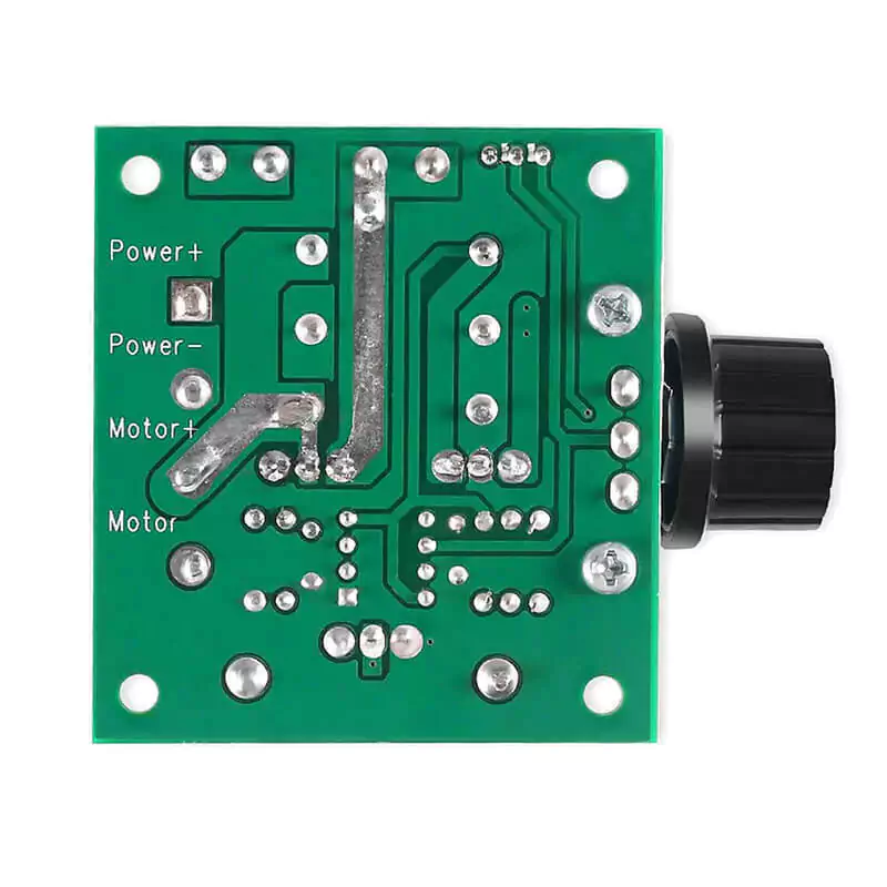 Conectar la carga al controlador y alimentar con el voltaje adecuado. Se recomienda utilizar un fusible en línea para protección contra cortocircuitos. Controla la velocidad del motor fácilmente con el potenciómetro.