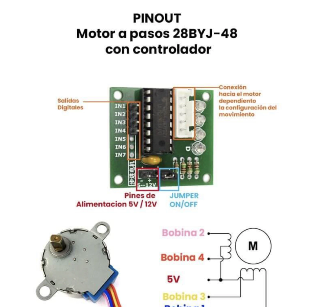 El Motor a pasos 28BYJ-48 es un pequeño dispositivo electromecánico paso a paso unipolar integrado por un driver o etapa de potencia basado en el chip ULN2003A. Este componente nos permite suministrar la energía suficiente al motor paso a paso para que se mueva.