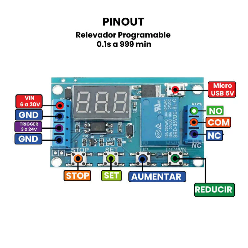 El Relevador Programable 0.1s a 999 min , es un dispositivo electrónico qué te permite controlar (por medio de sus cuenta con siete configuraciones distintas) el comportamiento de un relevador electro-mecánico.