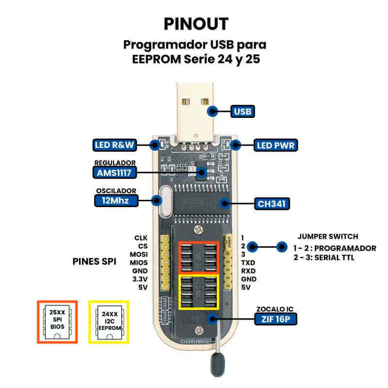 El Programador de BIOS EEPROM Serie 24/25 CH341 USB es una herramienta versátil para leer y escribir chips BIOS y EEPROM de las series 24 y 25, comúnmente usados en PCs, laptops y otros dispositivos electrónicos. Incluye: